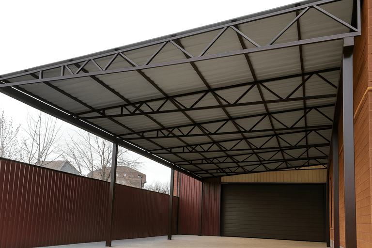 Чем больше площадь перекрытия, тем выше расход материалов и трудозатраты. Для маленьких навесов можно использовать облегчённые решения, тогда как для больших потребуются усиленные опоры и фермы. -